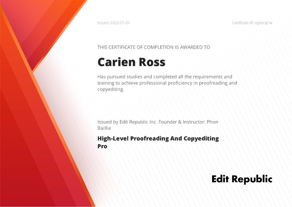 - Certificate of Completion of High-Level Proofreading and Copyediting Pro through Edit Republic